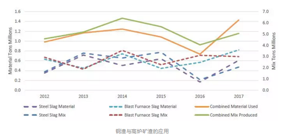 該調查還表明,在2017年的施工季節,新瀝青路面混合料中使用了近7900萬(wàn)噸再生材料,與2016年的數量差不多。2017年,美國除了繼續將RAP和再生瀝青瓦(RAS)應用于新路面,還使用了其他再生材料——包括輪胎橡膠、鋼渣、高爐礦渣以及再生纖維素纖維(Cellulose Fiber)。其中,僅RAP與RAS兩項就比應用原始材料節約超過(guò)22億美元的成本。雖然沒(méi)有統計全國的用量,但是根據調查受訪(fǎng)者的反饋信息,約有150萬(wàn)噸輪胎橡膠、礦渣、纖維素纖維和其他廢棄材料被循環(huán)利用到將近750萬(wàn)噸的瀝青路面混合料中。